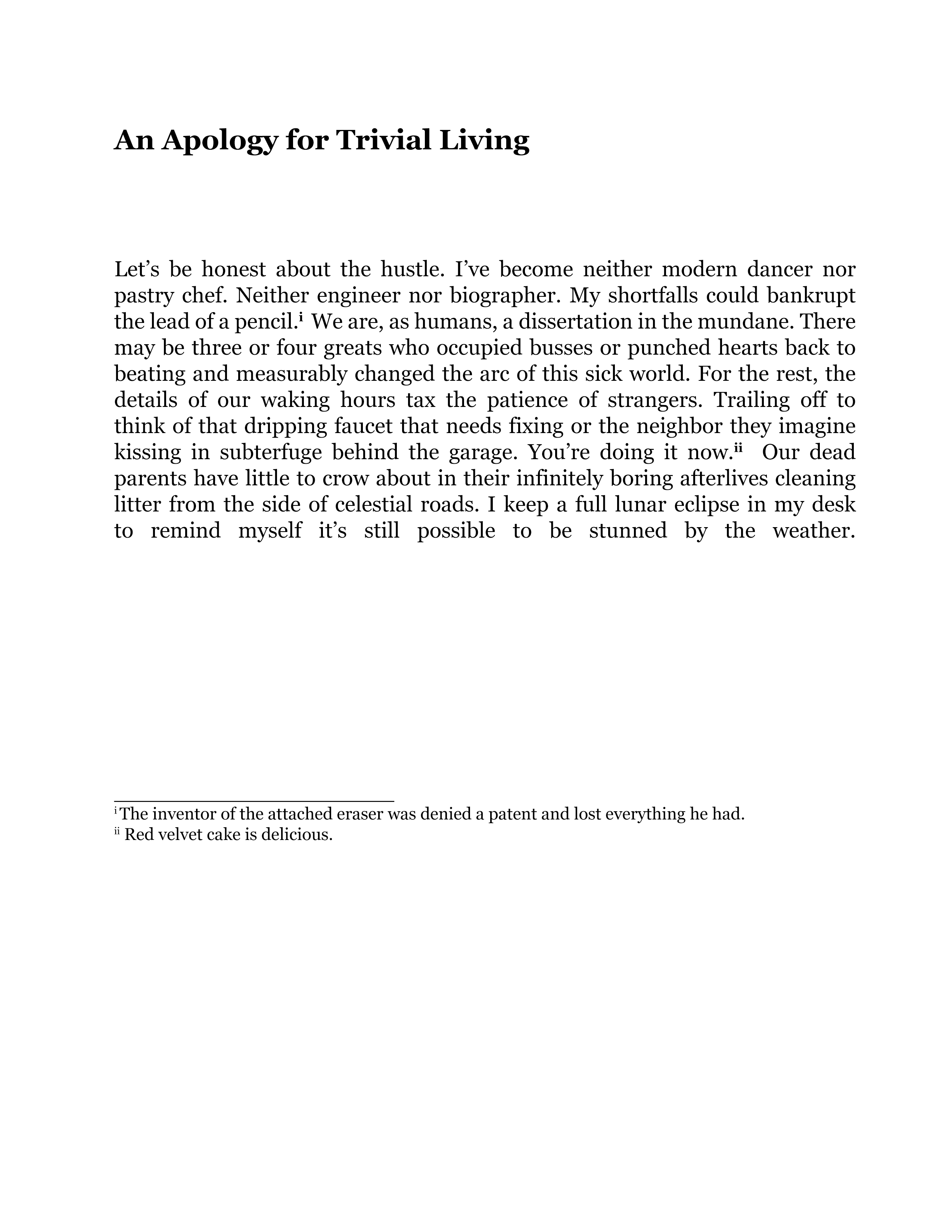 Thesis: A “dissertation in the mundane” done with precision and honesty becomes no longer mundane. These poems often have a feeling of being trapped, having no good path forward, no sturdy ground on which to stand. They’re desolate at times, I’d say. But they’re sly, because within the seemingly bleak world view—“her only medicine is to punch”—there is humor and keen observation. And maybe even some reverence for the absurdity. Maybe some tenderness. In the poem “An Apology for Trivial Living,” the speaker belies a cynical stance by keeping “a full lunar eclipse in my desk to remind myself it’s still possible to be stunned by the weather.” There is a powerful imagination at work in these poems and a wry playfulness that is anything but mundane.