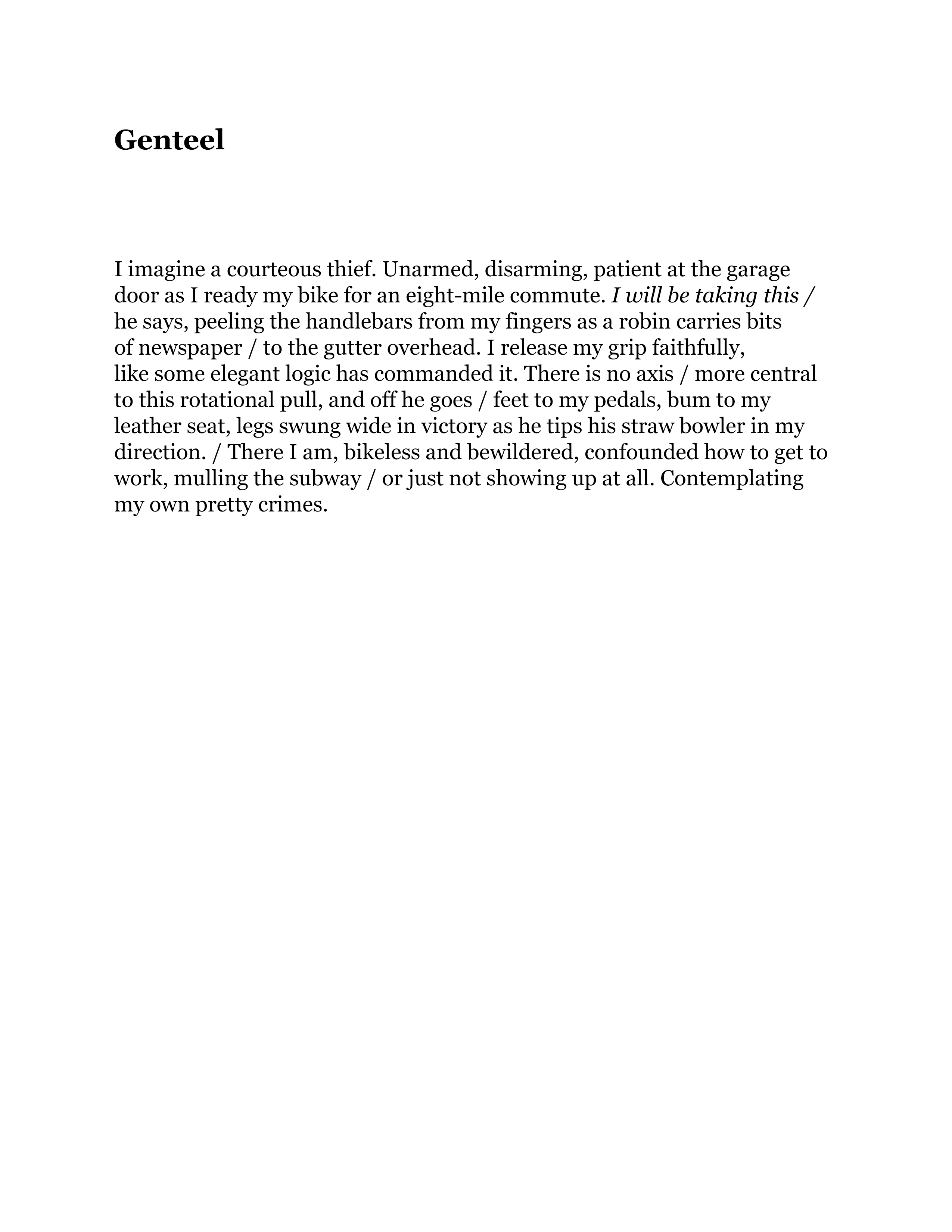 Thesis: Not knowing is the truth. The speaker of “Please Try Again” seems to believe (maybe even to hope) that when it comes to Church, “some people get it” and “the rest of us lie”—but I think the poem actually knows that we all feel uncertain and afraid that everyone else gets it. We all pretend to know what the hell is going on sometimes (most of the time?). What am I trying to say about these poems? They keep me guessing. I feel a little dumb trying to describe them. But they really grab me and get me. Like in the poem “Genteel,” when the thief steals the bike and the speaker is “bewildered, confounded how to get to work” and I know that feeling, that befuddlement, standing on a threshold wondering how you are going to get through the day.