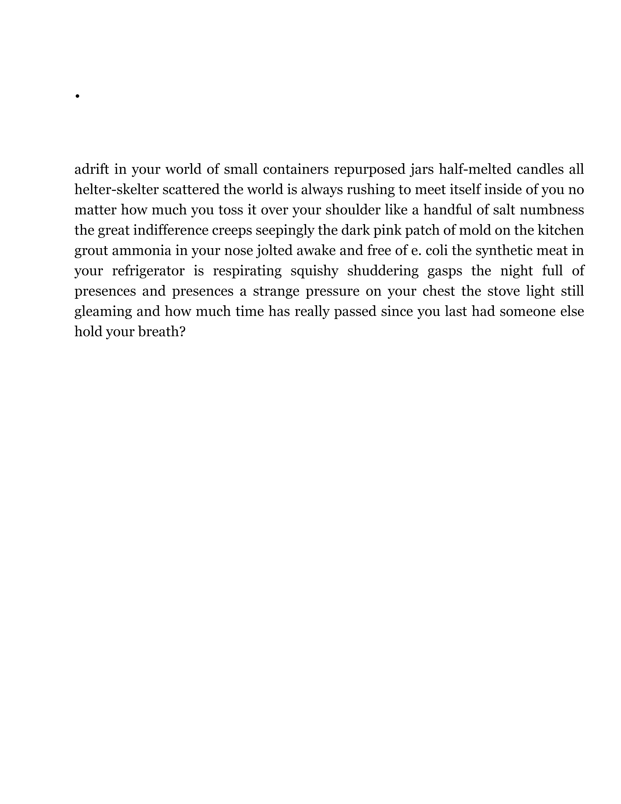The poems that follow move through a world that is porous and buzzing with presence. In one, the speaker notices mold on kitchen grout, meat in the refrigerator that seems to breathe, a strange pressure on the chest in the middle of the night. In another, they count leaves on a small black locust tree and scour clover for four-leaf aberrations. What struck me was how the speaker moves between dread and wonder almost interchangeably, as if they are two sides of the same heightened attention. This is something I recognized in myself—the way anxiety and awe can feel nearly identical, both of them a kind of trembling alertness to the fact that the world is much more alive than we usually let ourselves believe.