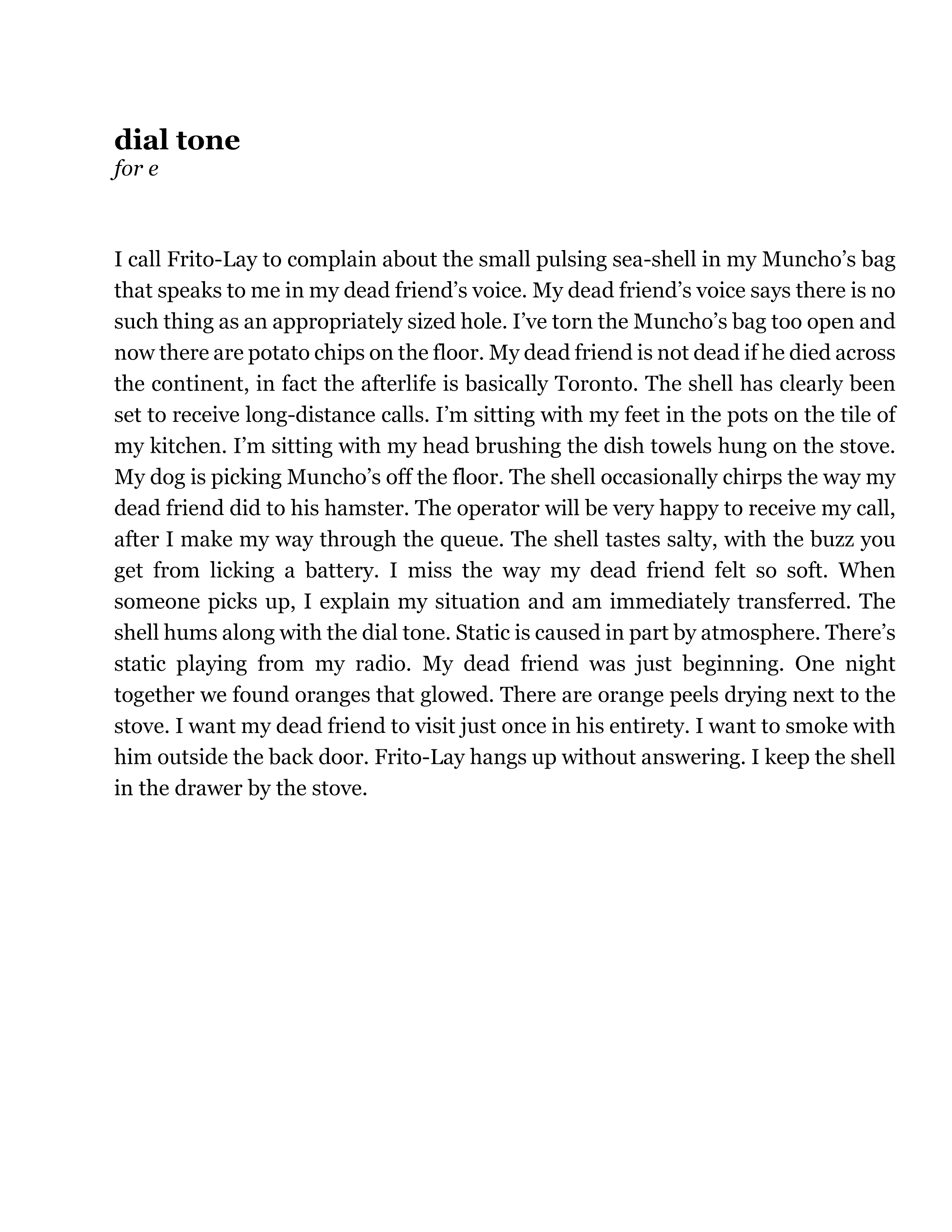 The first poem in the packet, "dial tone," is the one that stayed with me longest. It follows a speaker who calls Frito-Lay to complain about a sea-shell in their snack bag that speaks in the voice of a dead friend. On the surface this is absurd, and the poem knows it. But underneath the humor is a grief so raw and specific it's almost hard to look at directly. The detail that undid me was this: "I want my dead friend to visit just once in his entirety." Not in dreams, not in signs, not in shells inside chip bags—just wholly, fully, in person. It's the kind of wish that grief makes you feel and that most of us are too embarrassed to say out loud. Reading it felt like being given permission to want impossible things.