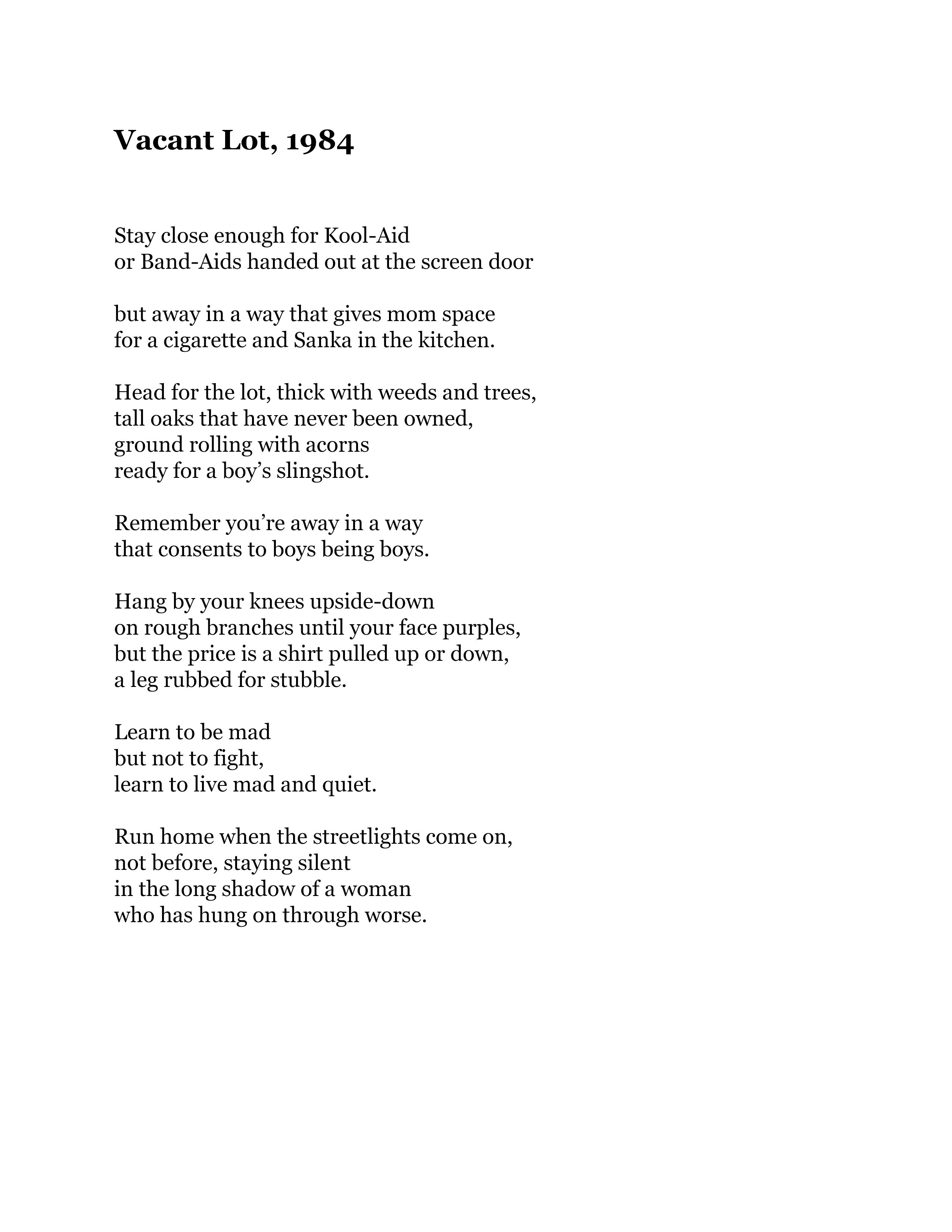 In “Vacant Lot, 1984” a young girl navigates her troubled home life by leaving the house often to hang out at a nearby vacant lot. What happens in the home and in the unsupervised lot is not explicitly stated, though the shadows of violence lurk long in the background. I find myself compelled by the choices of what is concealed and what is revealed in these poems. “Learn to be mad/ but not to fight,/ learn to live mad and quiet,” the poet writes, and I am in awe of the way this lesson learned through trauma is being confronted and actively unlearned in these poems.