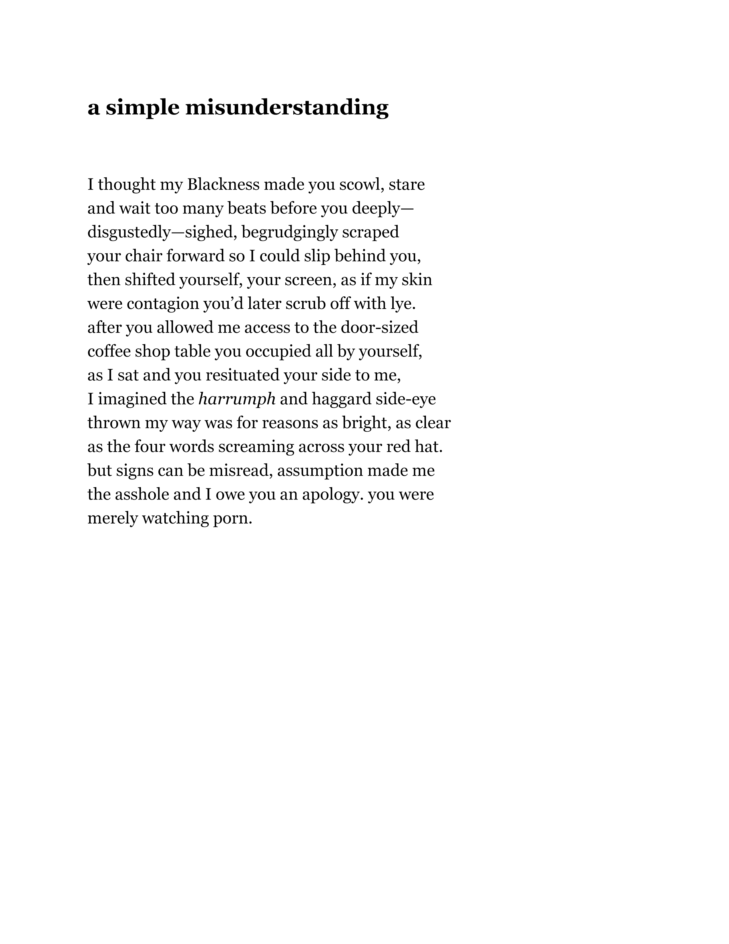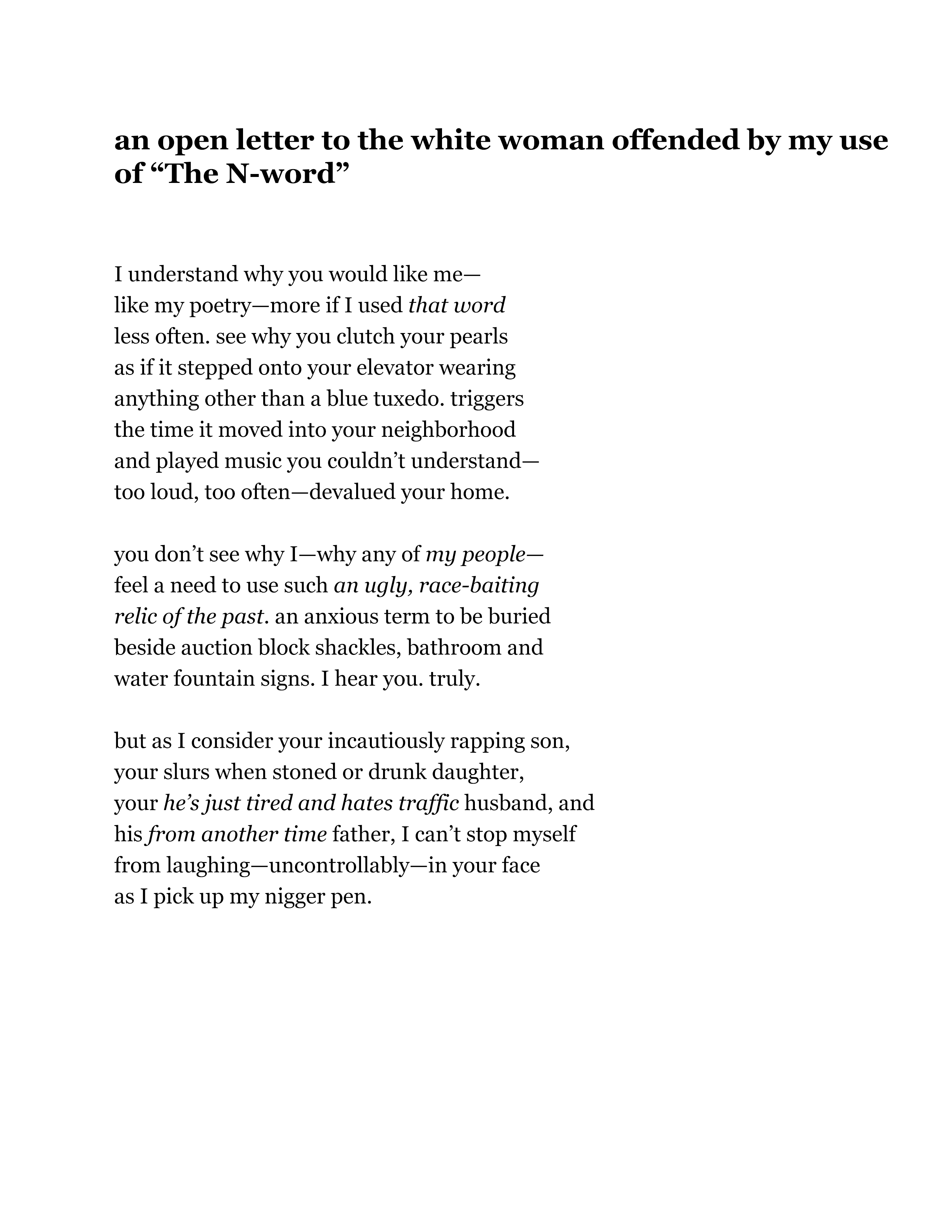 In conclusion, I was inspired to write this piece of open communication between two poets because of my opportunity to be introduced to the poet in these 3 poems. “a simple misunderstanding,” gives the reader, and in my case, the writer of this piece, a chance to see a bigger picture and clear the aired misconceptions. In turn, my use of italics came directly from, in "an open letter to the white woman offended by my use of “The N-word." “Harrumphs trigger staring don’t ask what went wrong ask what went right” were words I chose to put in italics to communicate the mutual understanding that this poet knows we all need… We can all read surfaces and faces; but if we take the time there is a world of language underneath. What’s behind the italics of our faces is more than a font.