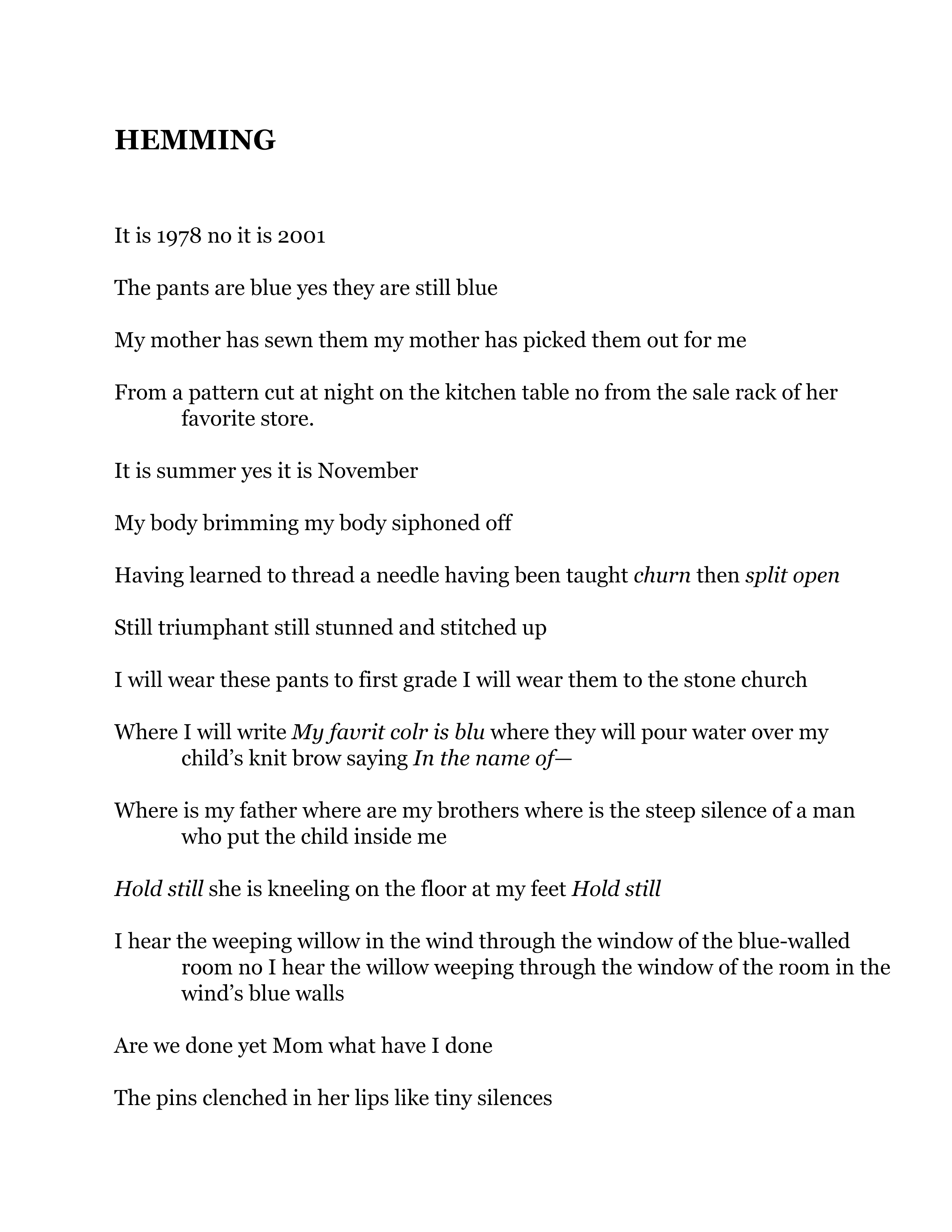 As these poems drift through time–sometimes steering the ship, sometimes steered by what they uncover–they follow a light that is (as noted above) a “smudge,” “blurred,” “blanched,” and “futile and / beautiful,” (borrowed, importantly) when it is not defining through its absence: “nights // the dark of.” Though these direct uses don’t appear in “Hemming,” “night,” “summer,” and “November” are particular junctions between time and light that summon our personal experiences, specifically lit by how the sun hangs in the sky. The image of the mother toiling at the kitchen table at night is incandescent in the details it reveals and the ones it asks us to envision. Light here is a tool that helps us understand that–while the vast distances between us are ultimately insignificant–proximity blurs definition.