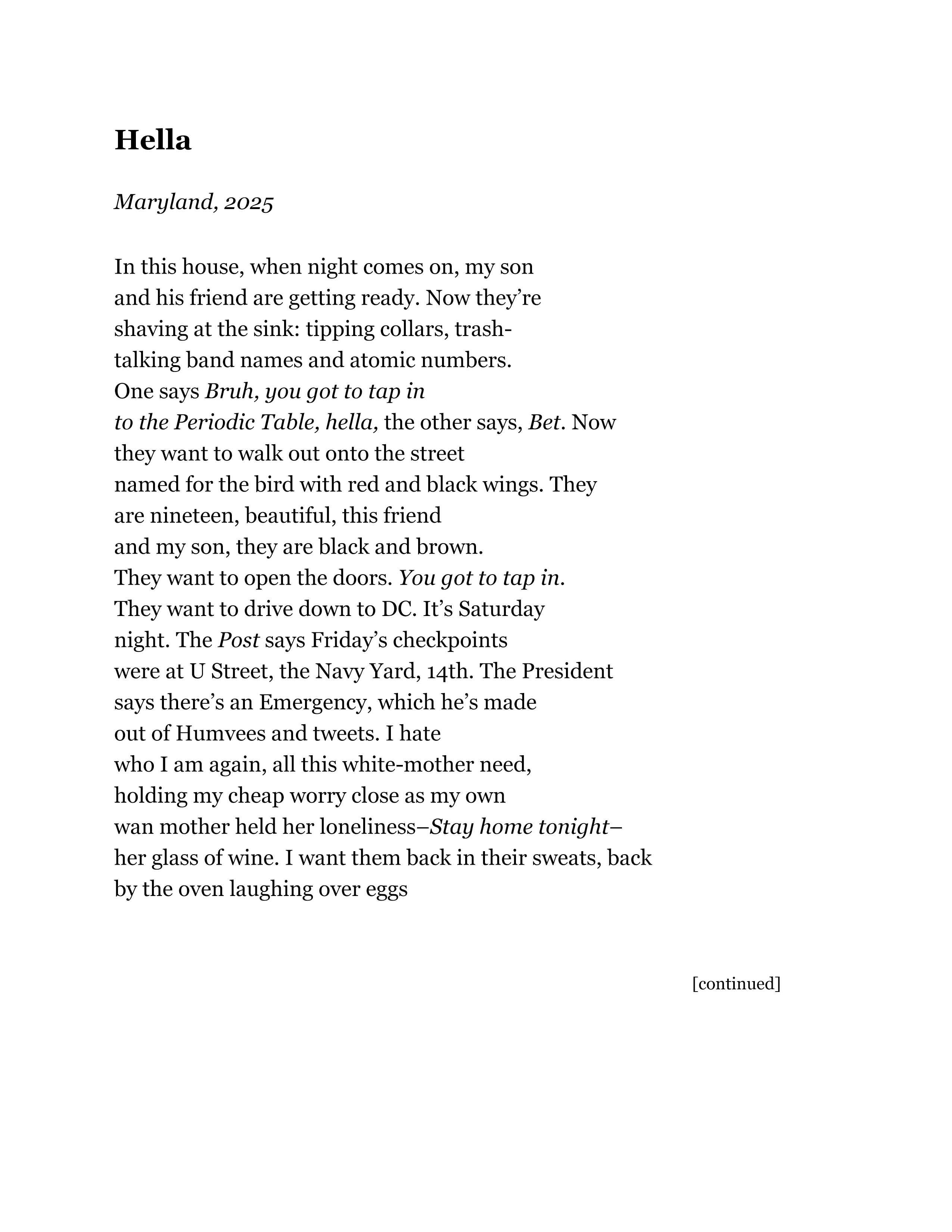 I never had children of my own. But for the first time in 26 years, all of my students are Black and Brown—like the teens in “hella,” beautifully winged birds covered with more of my mother-worry than I previously thought possible. I too fear sending them into a world of tweeted checkpoints and ICE alerts when I must educate them on why they should care our monuments are being torn down, our history erased and rewritten. Yesterday they joked about water spilled on the classroom floor. I told them we’re being drowned, again. Today one of my young ladies asked about the difference between “race,” “ethnicity,” and “nationality.” A lesson I often taught in predominately white spaces hits different for students proud of being Haitian, Puerto Rican, Cape Verdean, Bahamian, Bajan, and Jamaican. Faces only seen as “Black” when venturing the map of lighter neighborhoods. I explained the term “African-American” as the trans-Atlantic slave trade, the hyphen representing the ocean between continents. Told them how a colleague once—without missing a beat—replied, “…and if you look real close, you can see the boat.” Only one student thought to ask if that former colleague was white.