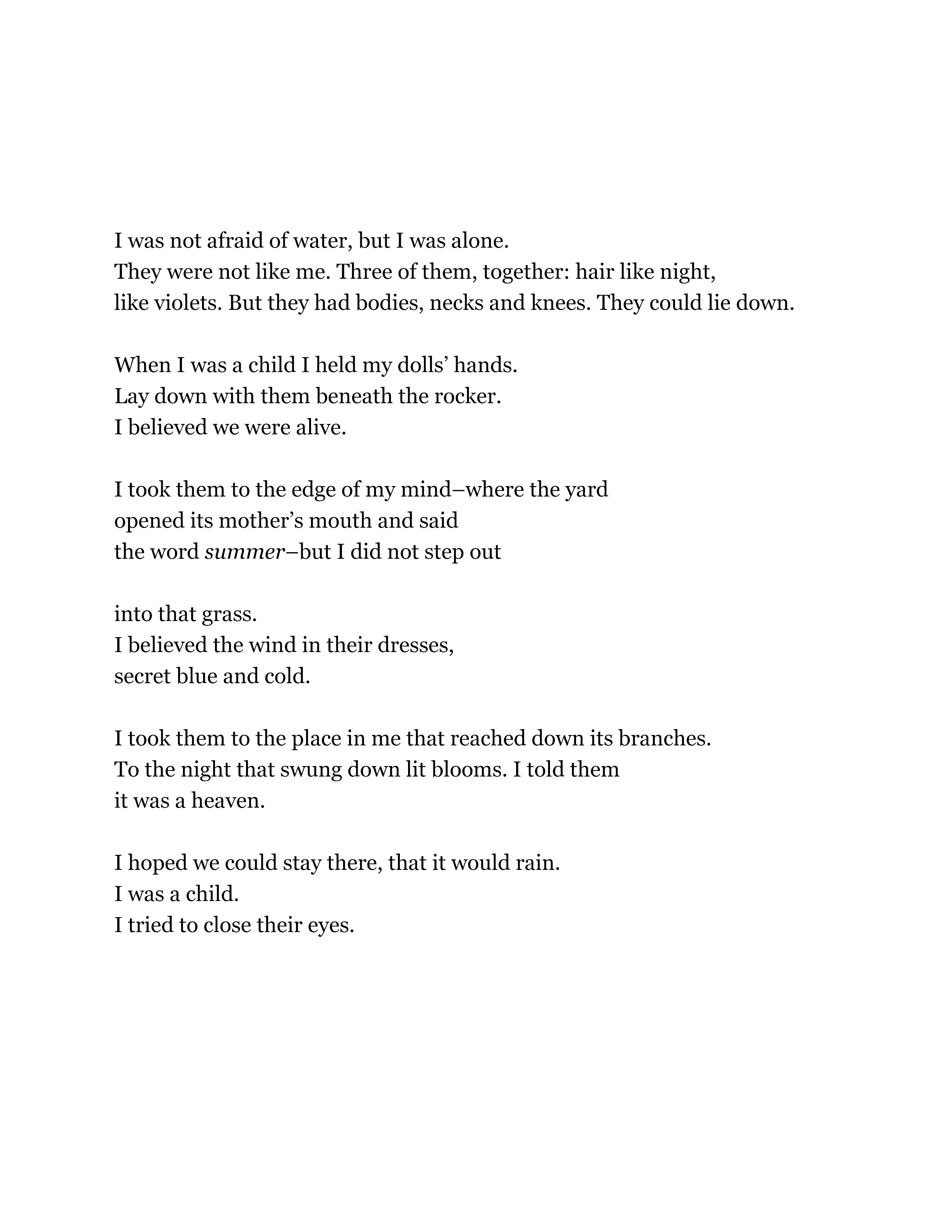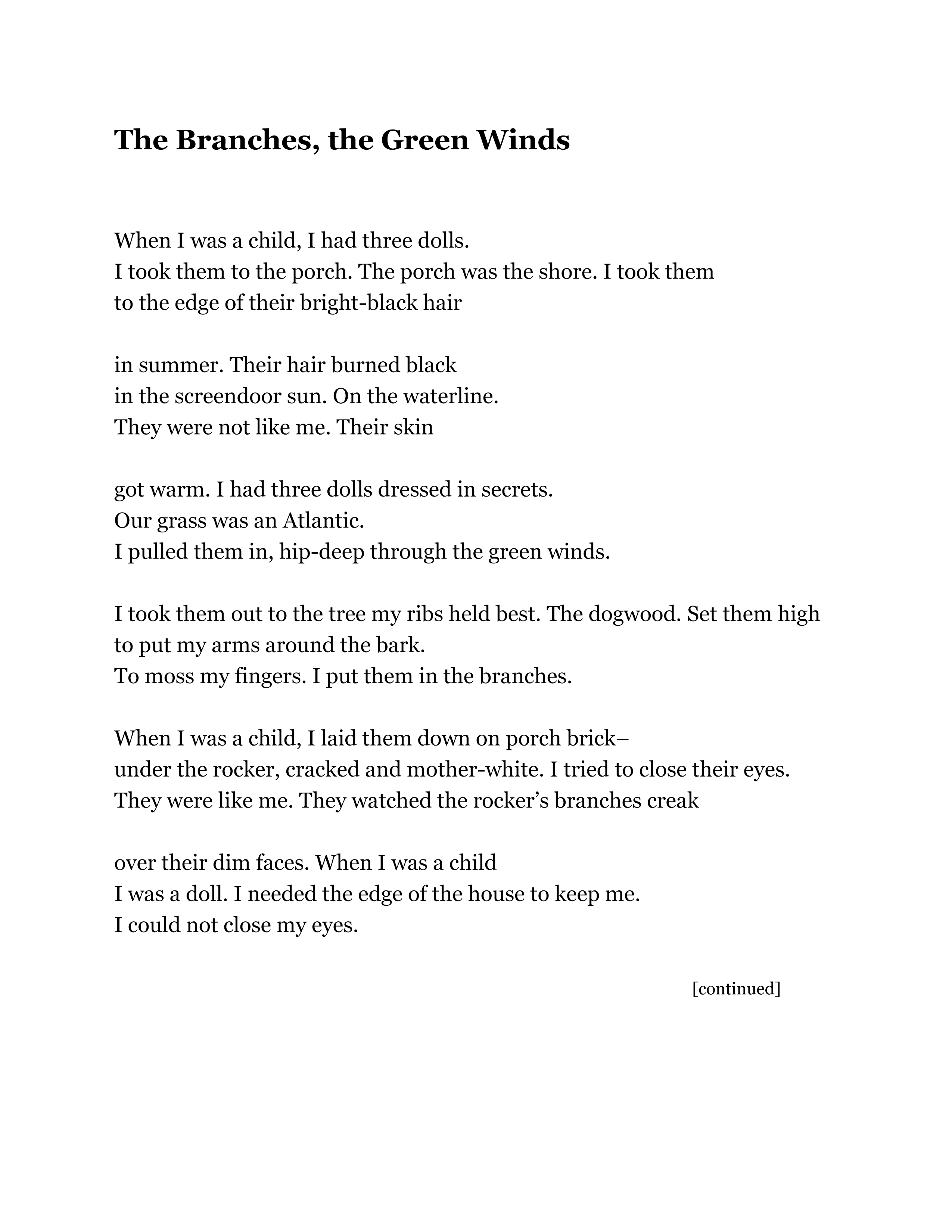 “The Branches, the Green Winds” reminds of how, when I was a child, I cared for my action figures, my siblings’ hand-me-down dolls, our toy cars and teddy bears as if they were people. Gi-Joe and Barbie equally seated at the dining table and command console, feeding and being fed. How the idea of home is clutched to our young chests as we play and protect inanimate loves better than ourselves. Psychologists may argue such childhood explorations of roles and boundaries craft and expand the liminal spaces of our later relationships. For me, four walls and a closed door were sealed like the black box of my mind. There were no noises outside. No screaming voices. My eyes remained open, uninterrupted with my chosen people.
