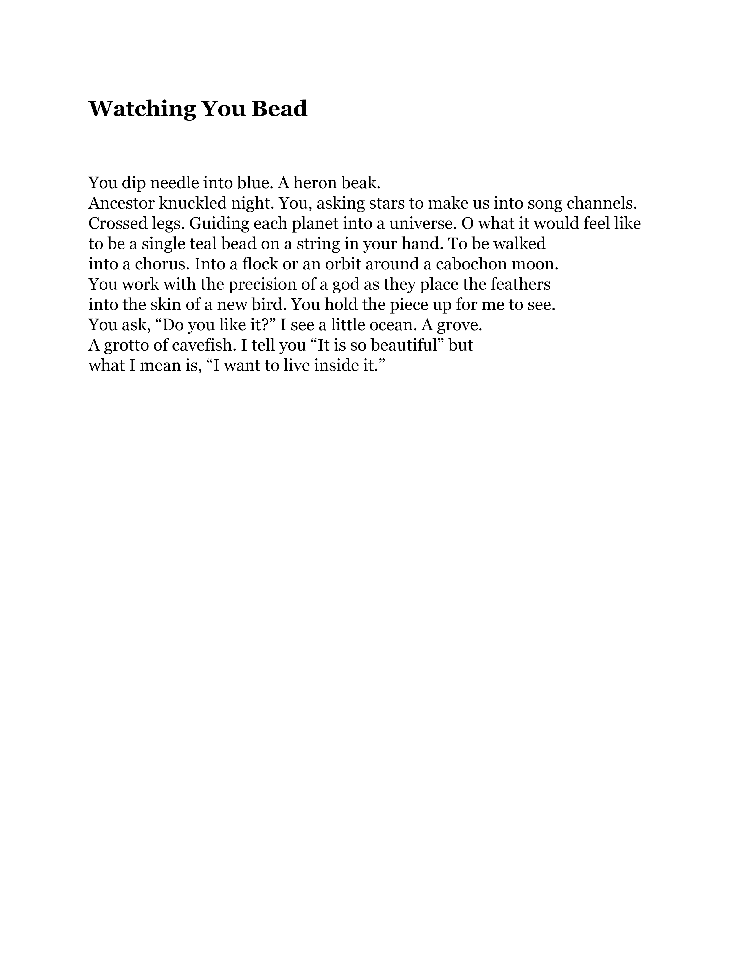 When I was 14 I had my first creative writing class with Jeff Kass at Pioneer High School. In a public school with 3,000 students, it was easy to get lost, to lose oneself, to check out, but in that classroom I came alive for the first time in school. His lessons burned into me, and I have passed them on to many generations of students: “show me, don’t tell me. Poems that are abstract are universal, but poems with concrete, specific images are unforgettable and uniquely yours.” This series of poems—"Second Class Relic,” “Watching You Bead,” and “Ode to Uncertainty”—they show me. They generously offer us readers a vivid, intimate glimpse into the poet’s life. “You dip needle into blue. A heron beak. / Ancestor knuckled night. You, asking stars to make us into song channels.” The language awakens me, surprises me, ruffles my chest like the first day of creative writing class my freshman year.