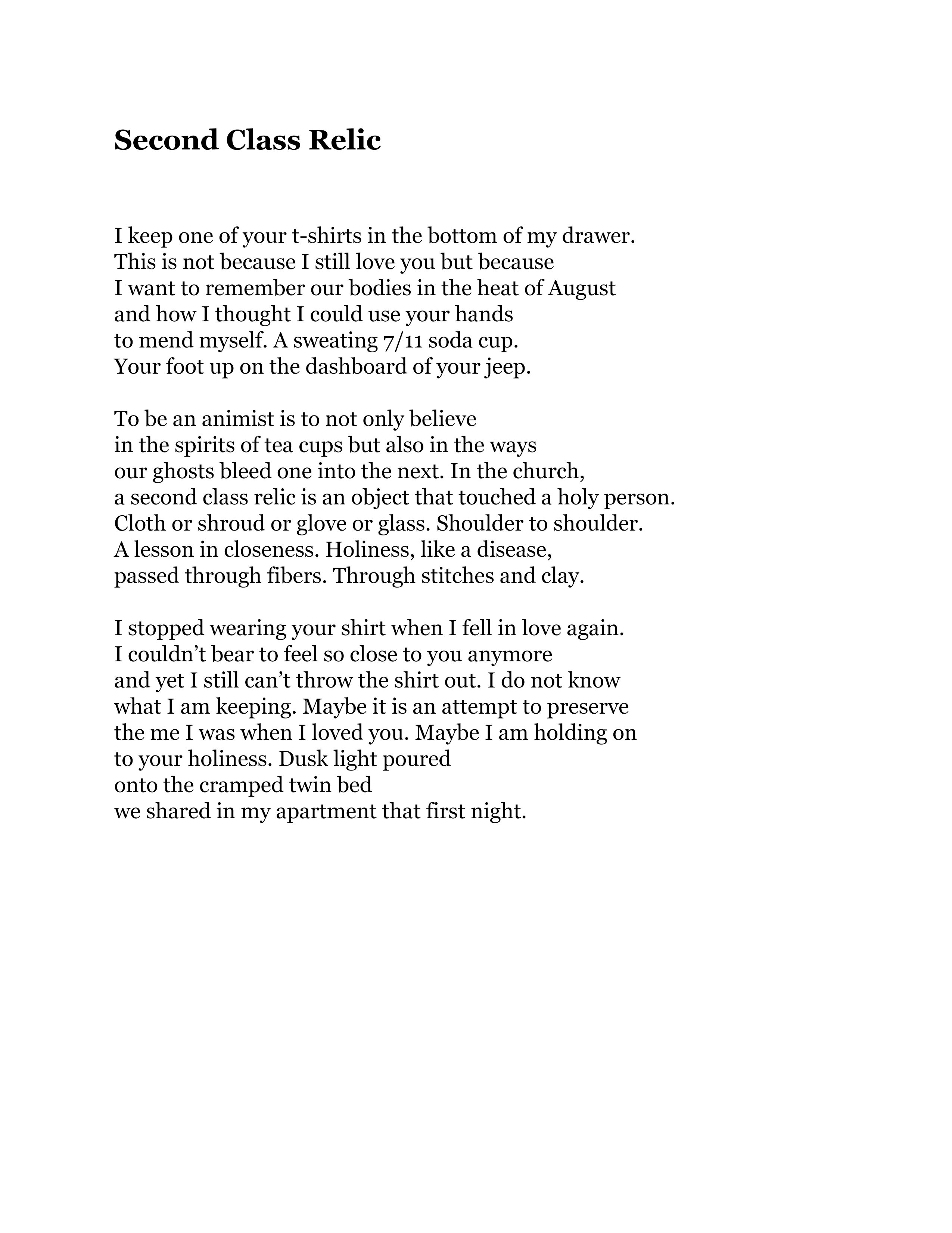 These poems returned me to my younger self in more ways than one. Nostalgia washed over me as I read “Second Class Relic,” thinking of all the artifacts from past relationships I can’t bear to part with, stuffed in boxes in my basement like a museum of lost loves. “I stopped wearing your shirt when I fell in love again. / I couldn’t bear to feel so close to you anymore / and yet I still can’t throw the shirt out.” I don’t know the whole story but I feel all the feelings. To be a poet is to be a tender archivist. To keep emotional artifacts like butterflies pressed beneath glass. “Maybe it is an attempt to preserve / the me I was when I loved you.” Poet Shira Erlichman says “[w]riters, too, are taxidermists.” We revisit past versions of ourselves with wiser eyes, ready to open the boxes in the basement, the jars lining the shelf. Ready to eat our pickled joy and revise our pain. This writer is unafraid to linger in longing and lay in the bed of first love.