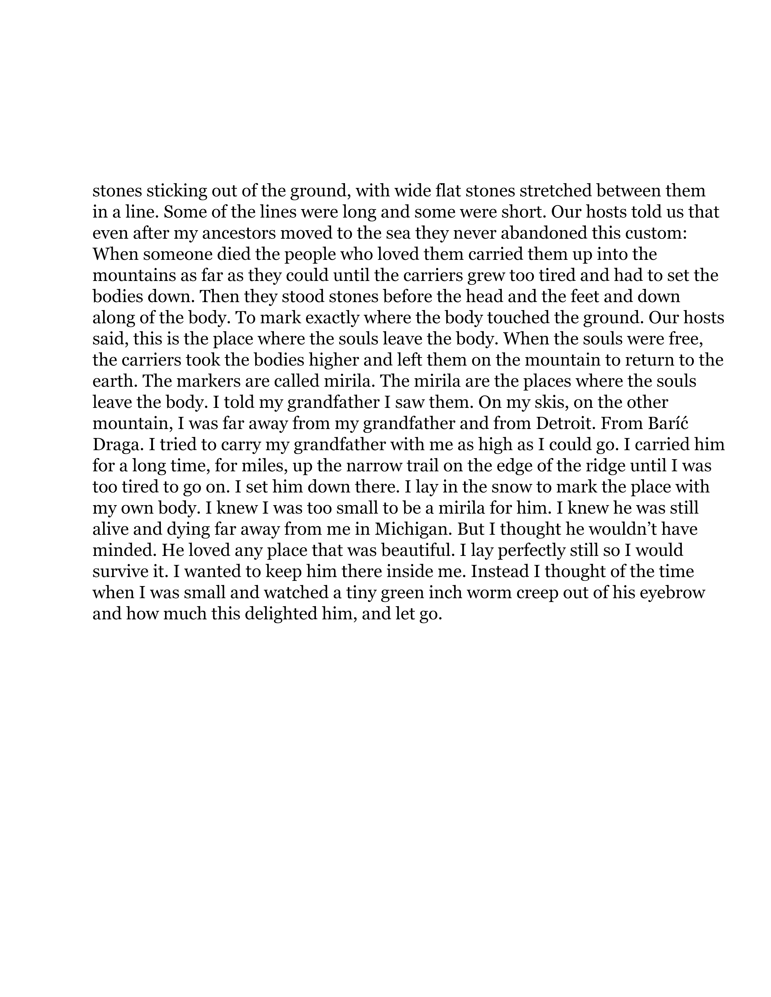 With gentleness and an eye for detail, these poems feature brief moments of connection and memory that unfurl into intimate universes. From a meditation with a heron to family stories that take us back to the poet’s family in Croatia, these poems tell stories of the ripples we make in one another’s lives. Through the use of a conversational tone, form, and vivid imagery, the poet creates a fabric of kinship that explores farewells and departures, essentially, elegies.