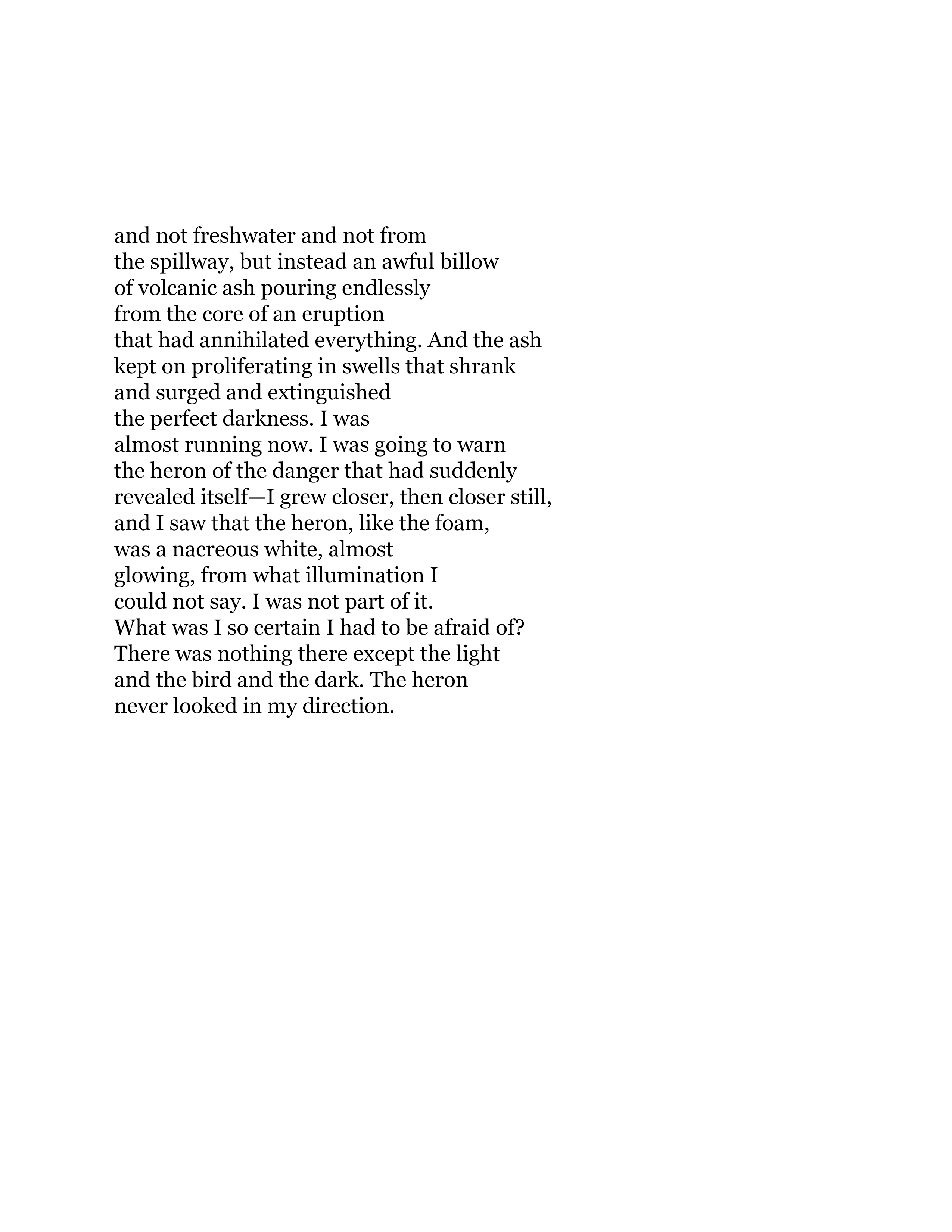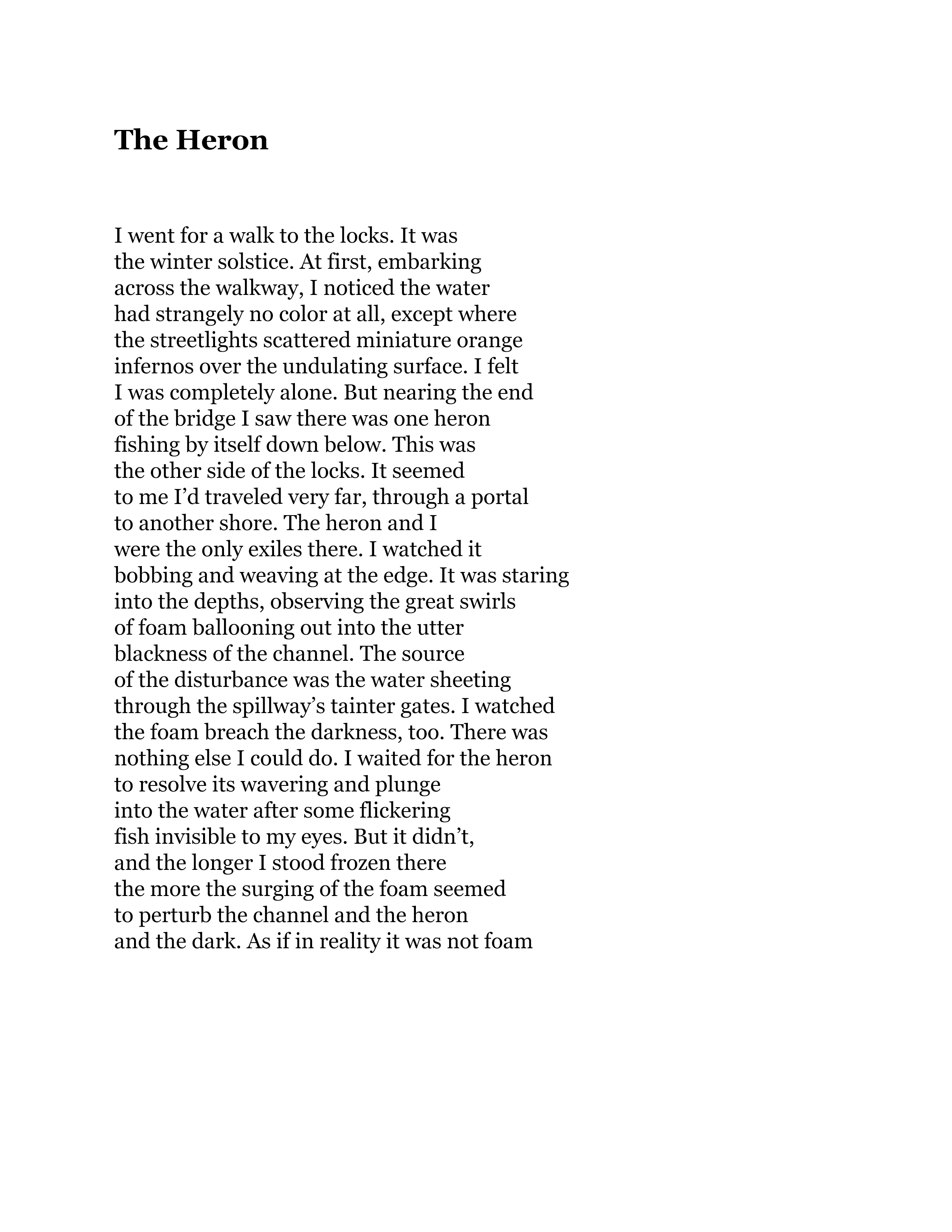 In “The Heron” the theme of grief and elegy is brought forth strongest through images. The speaker describes the heron in the water, saying, “It was staring / into the depths, observing the great swirls / of foam ballooning out into the utter / blackness of the channel.” I read this as a moment of the speaker finding themself in the bird, finding camaraderie there. In the lines “utter / blackness of the channel” I sense that grief that can occur at a threshold. Then, the real elegy of the poem is the moment the speaker understands that there was not the connection they thought there was between themself and the heron as they say, “The heron never looked in my direction.”