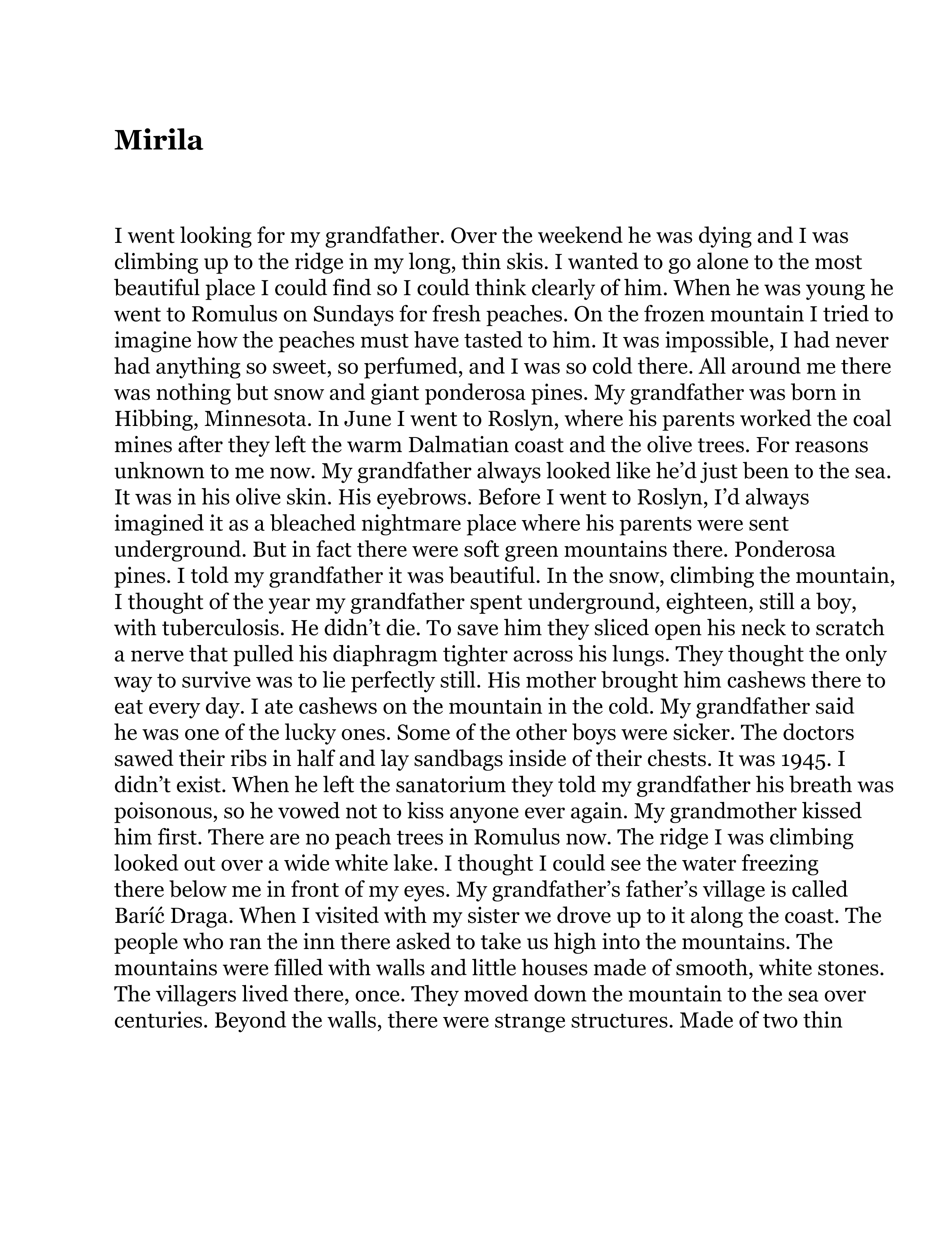 Prose-blocking formatting in “Mirila” conveys the weight and complexities of the emotions the speaker feels about their grandfather passing. Whereas line breaks serve as breaths or pauses in a line of verse, the condensed format confront the reader with the density of loss the speaker feels. They process the grief alongside curiosities about their grandfather’s emotions and experiences. There is not only the loss of their grandfather but loss of the peach trees as the speaker reflects, “There are no peach trees in Romulus now.” The elegy is about a tether to heritage and history as much as it is about the grandfather.
